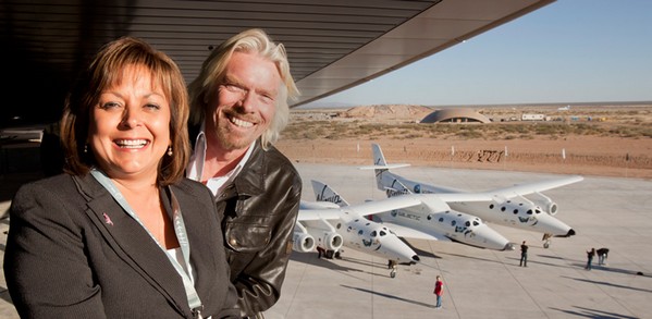 Virgin-topman Richard Branson en Susana Martinez, gouverneur van de staat New Mexico. Op de achtergrond SpaceShipTwo, vastgekoppeld aan 'moederschip' WhiteNightTwo. Foto: Virgin Galactic.