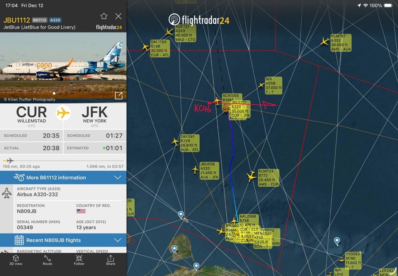 Volgens NOS-redacteur Dick Drayer op Curaçao betrof het JetBlue-vlucht 1112, onderweg van Curaçao naar luchthaven JFK in New York. Het incident deed zich voor 26 minuten na vertrek, in het Curaçaose luchtruim.