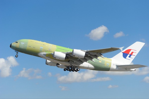 SCHIPHOL - De eerste Airbus die bestemd is voor Malaysia Airlines (MAS) heeft donderdag voor het eerst gevlogen. Het toestel steeg op vanaf Toulouse, waar Airbus de A380’s assembleert. Binnenkort wordt het toestel overgevlogen naar Hamburg, waar de installatie van het interieur plaatsvindt. Daar wordt het toestel ook in het volledige kleurenschema van MAS gespoten.