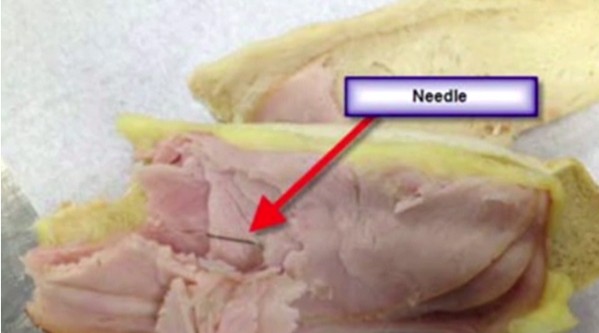 Het gaat om broodjes kalkoen. De naalden werden aangetroffen in vluchten van Schiphol naar Minneapolis, Seattle en Atlanta (twee vluchten). "Dit is een vreselijk schokkende situatie", zei Christina Ulosevich van Gate Gourmet tegen CNN. "Het gaat eerst en vooral om de veiligheid van de passagiers." Gate Gourmet heeft geen andere meldingen gekregen van broodjes die niet in orde zouden zijn. De cateraar zegt op CNN volledig mee te werken aan FBI-onderzoeken.
