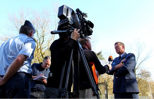 Commodore Theo Ten Haaf, commandant van het Defensie Helikopter Commando (DHC) op vliegbasis Gilze-Rijen, staat de media te woord. Foto: John Kuijsters.