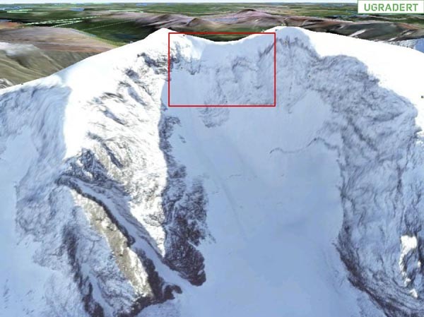 De plek op de berg Kebnekaise waar wrakstukken van de Noorse Hercules zijn aangetroffen.