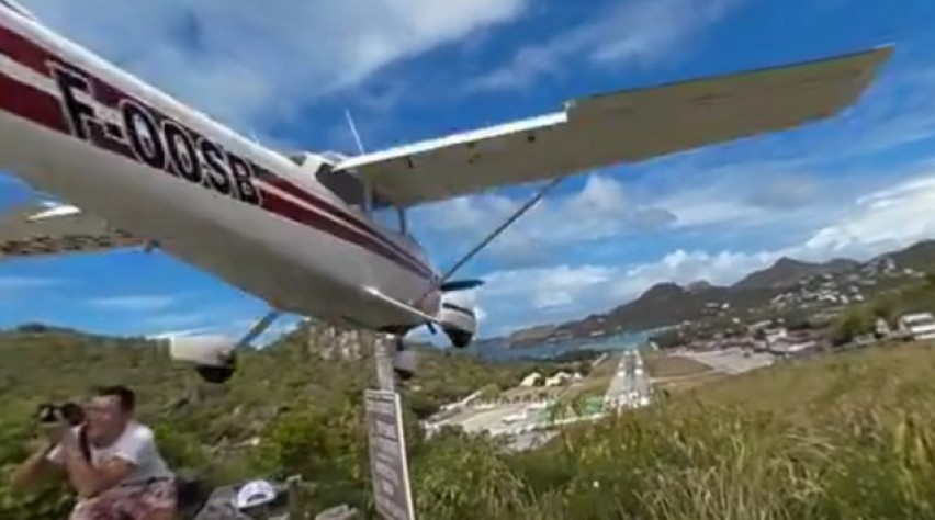 ST. BARTH'S - Een fotograaf heeft het maken van de plaat van zijn leven bijna met zijn leven moeten bekopen. Op een vorige week geplaatste internetvideo is te zien hoe de toerist op de heuvel aan de voet van de korte landingsbaan van het Caribische St. Barth's staat. De man doet zijn best de naderende Cessna 172 in beeld te krijgen, maar wordt op een haar na door het vliegtuig gemist.